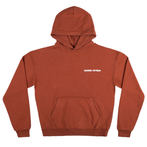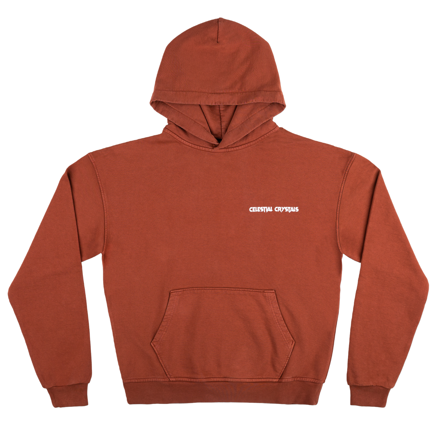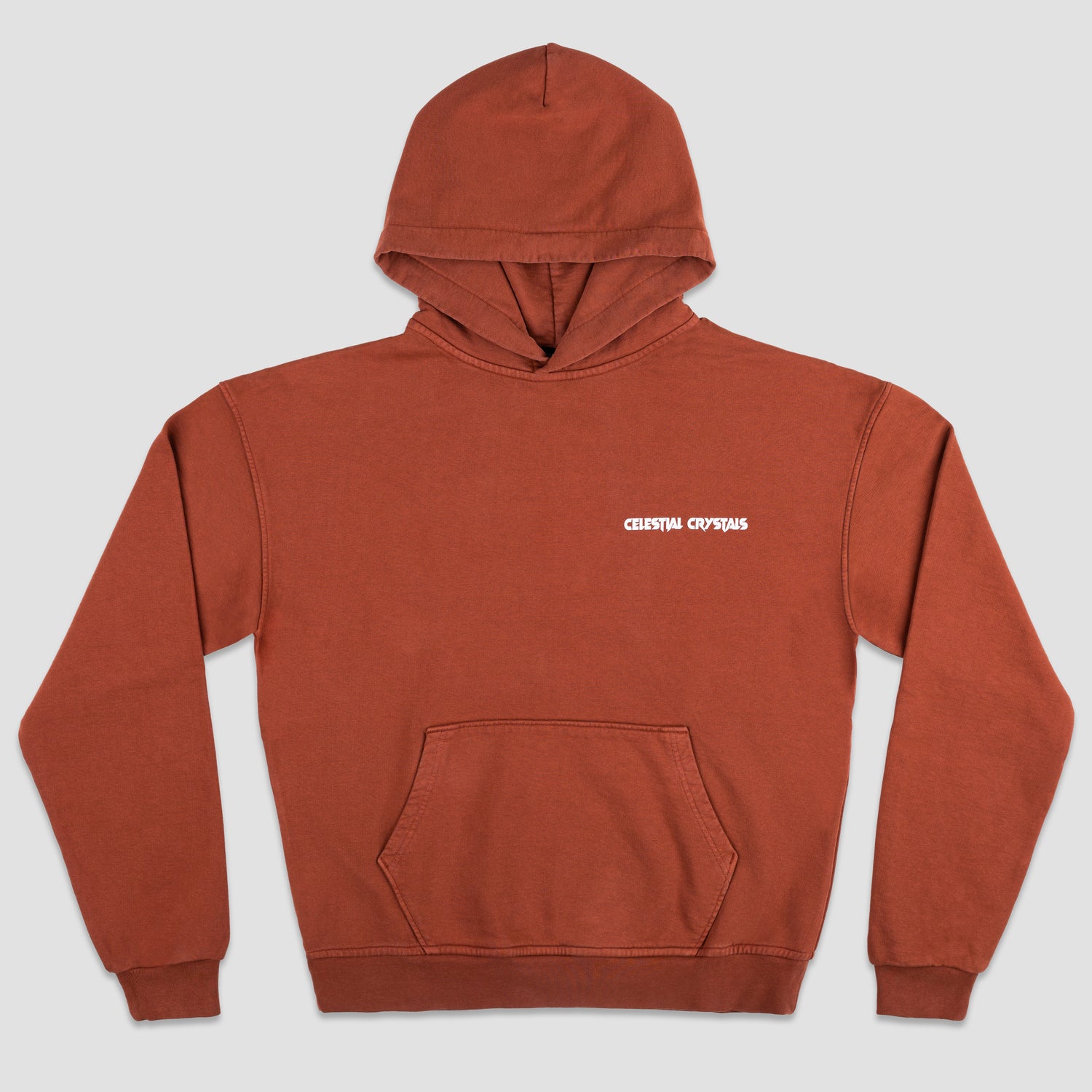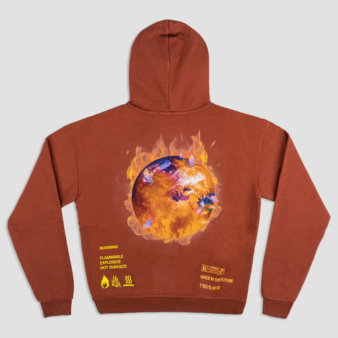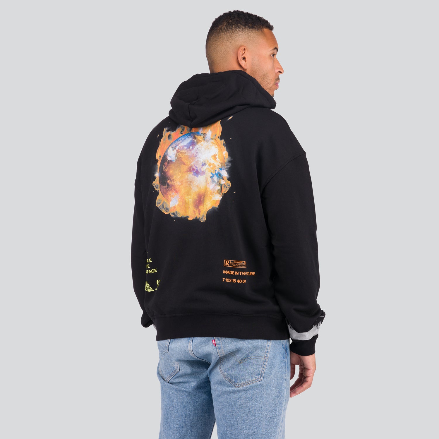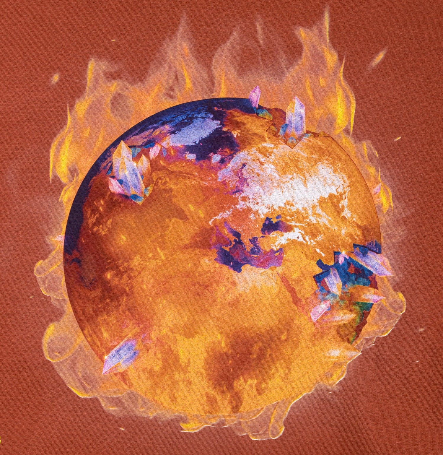 Sudadera con capucha de manga larga en negro con los cristales celestiales™ logo en el frente. Tierra en llamas con diamantes que sobresalen en la parte posterior de la sudadera con capucha. Llamas reflectantes dañadas alrededor de las mangas. Bolsillo canguro.